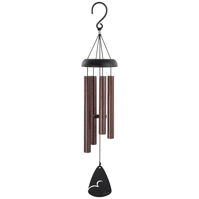 Chime has 5 heavy walled, center pinned tubes that emit a soothing and serene sound. Durable powder coated finish, all aluminum construction, and strung with industrial cord. Includes an adjustable striker.