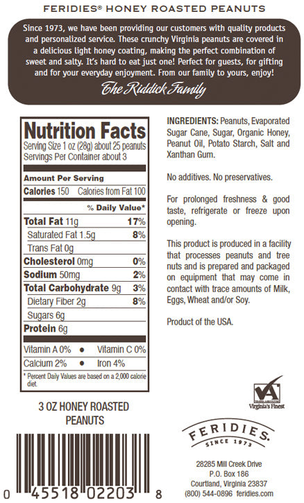Our Honey Roasted Peanuts are covered in a delicious light honey coating, making the perfect combination of sweet and salty. It's hard to eat just one! The 3oz re-sealable bag has a tear notch at the top making it easy to open and close. Shelf life is approximately 6 months. OU Kosher Certified and Non-GMO Project Verified.