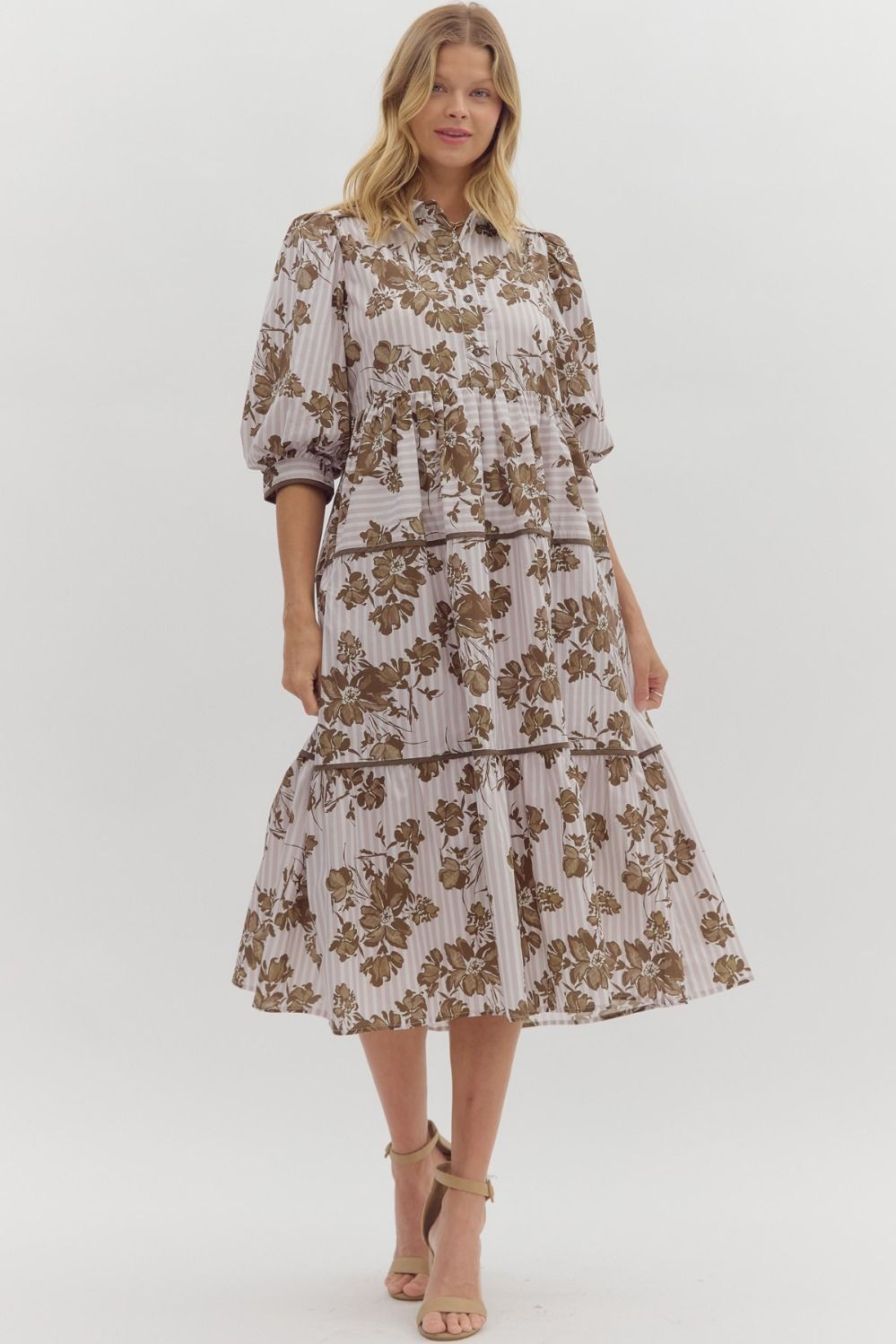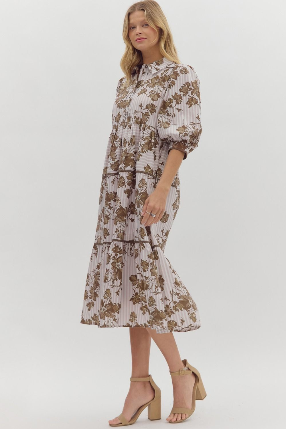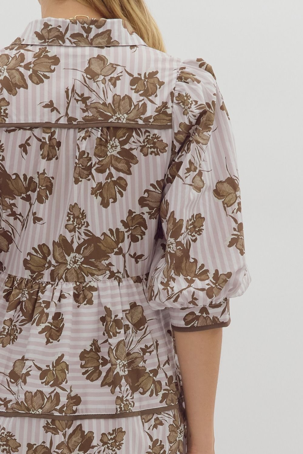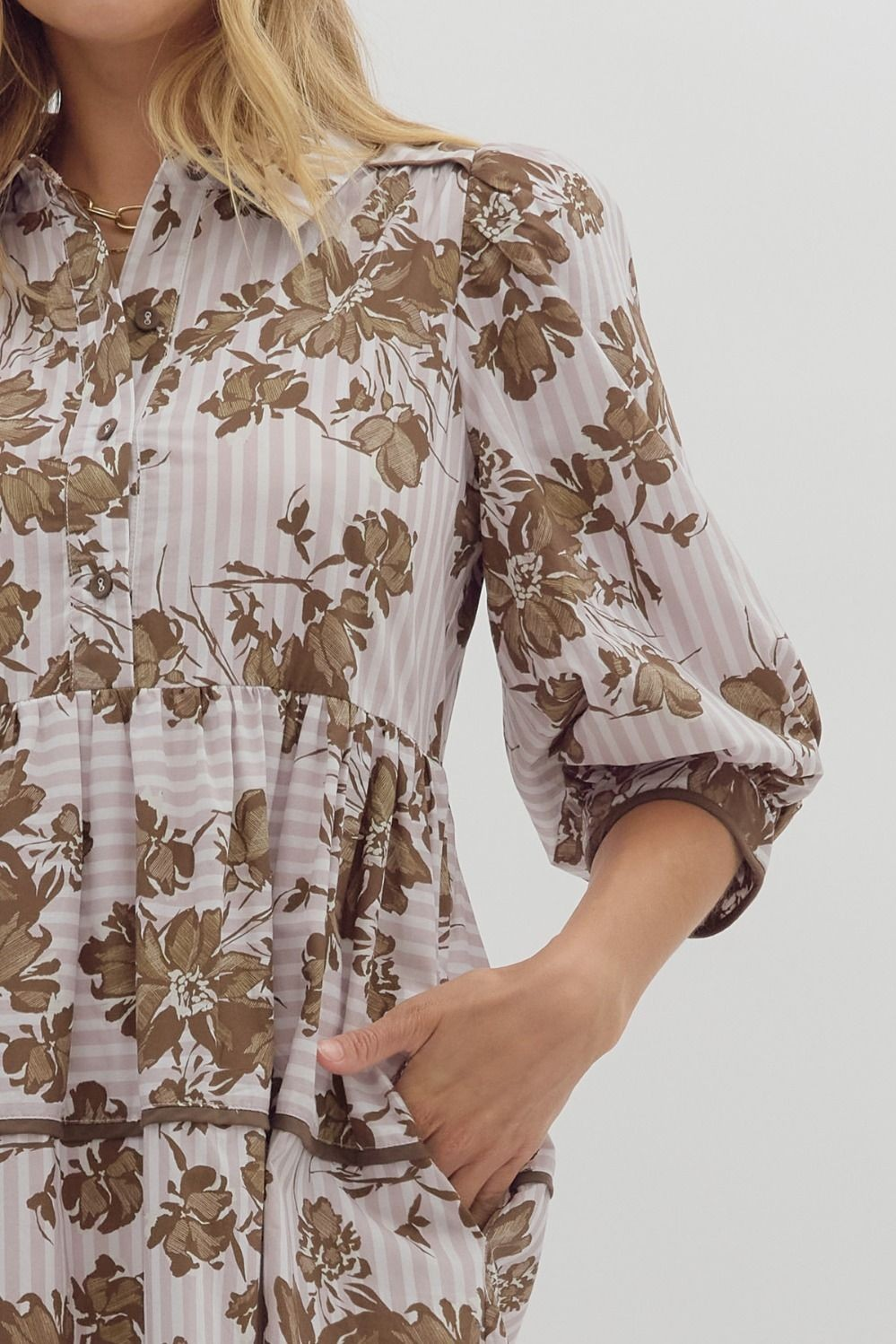 Floral print cuff band ¾ puff sleeve tiered mini dress featuring contrast binding detail. Collar button front closure. Pockets at sides. Lined. Woven. Non-sheer. Lightweight.