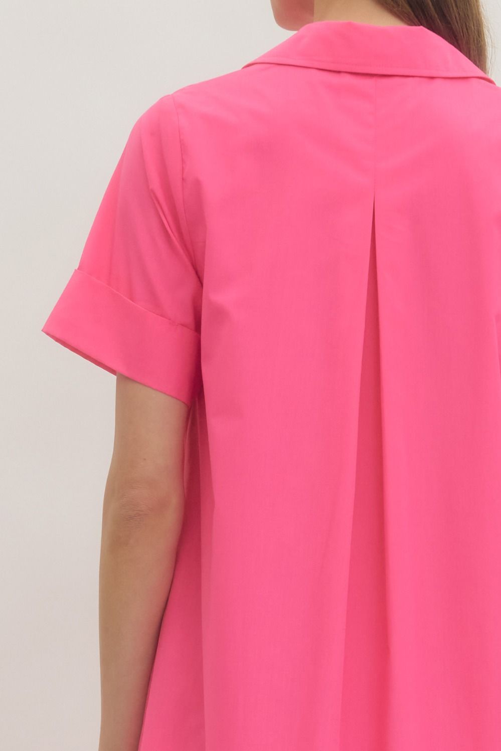 Solid short sleeve midi dress featuring shirt collar and snap button closure at front. Turn-up cuffs. Side pockets. Inverted pleat at back. Lined. Woven. Non-sheer. Lightweight.