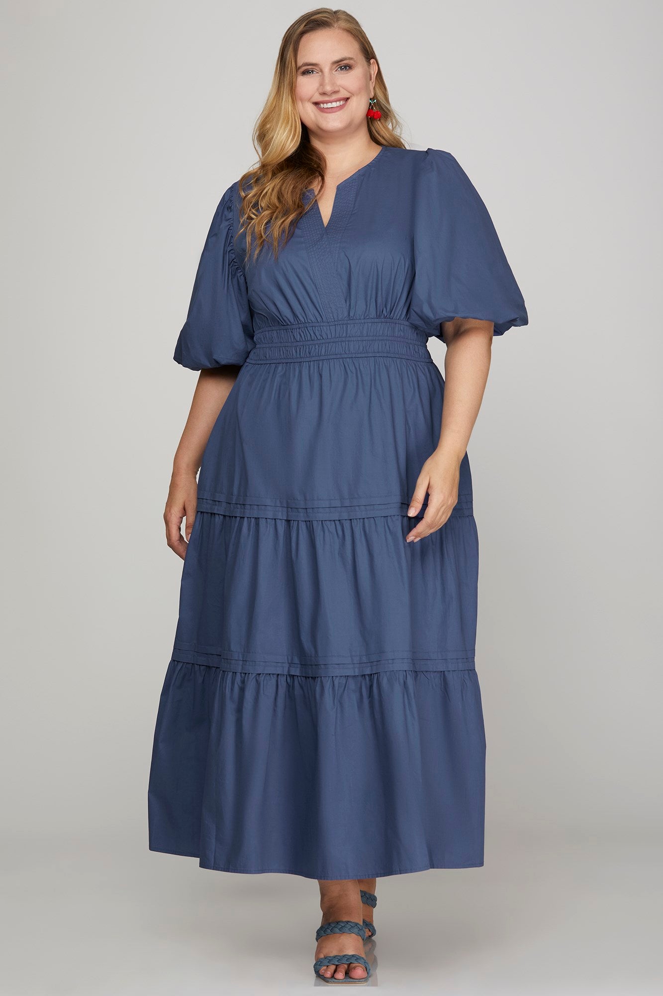 BALLOON HALF SLEEVE POPLIN WOVEN V NECK TIERED MIDI DRESS WITH POCKETS