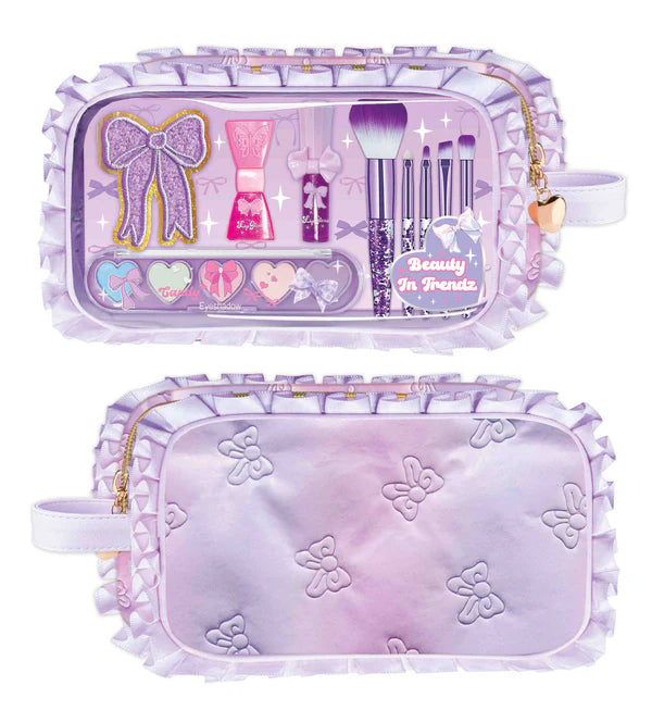 Get ready to glow with the Hot Focus Beauty in Trendz - Bowtiful set! This playful collection includes a 5-piece glitter makeup brush set, a shiny lip gloss, and a vibrant eyeshadow palette, all tucked inside a charming lavender ruffled zipper pouch. Plus, show off your style with a cute lavender bow chenille sticker patch. It’s everything you need to create dazzling looks on the go!