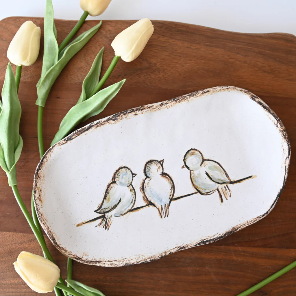 This elegant oval dish features a charming design of three birds perched on a wire, creating a delightful focal point. The minimalist aesthetic combines functional serving capabilities with artistic expression, making it ideal for both everyday use and special occasions. Perfect for serving appetizers, small treats, or as a decorative accent piece.