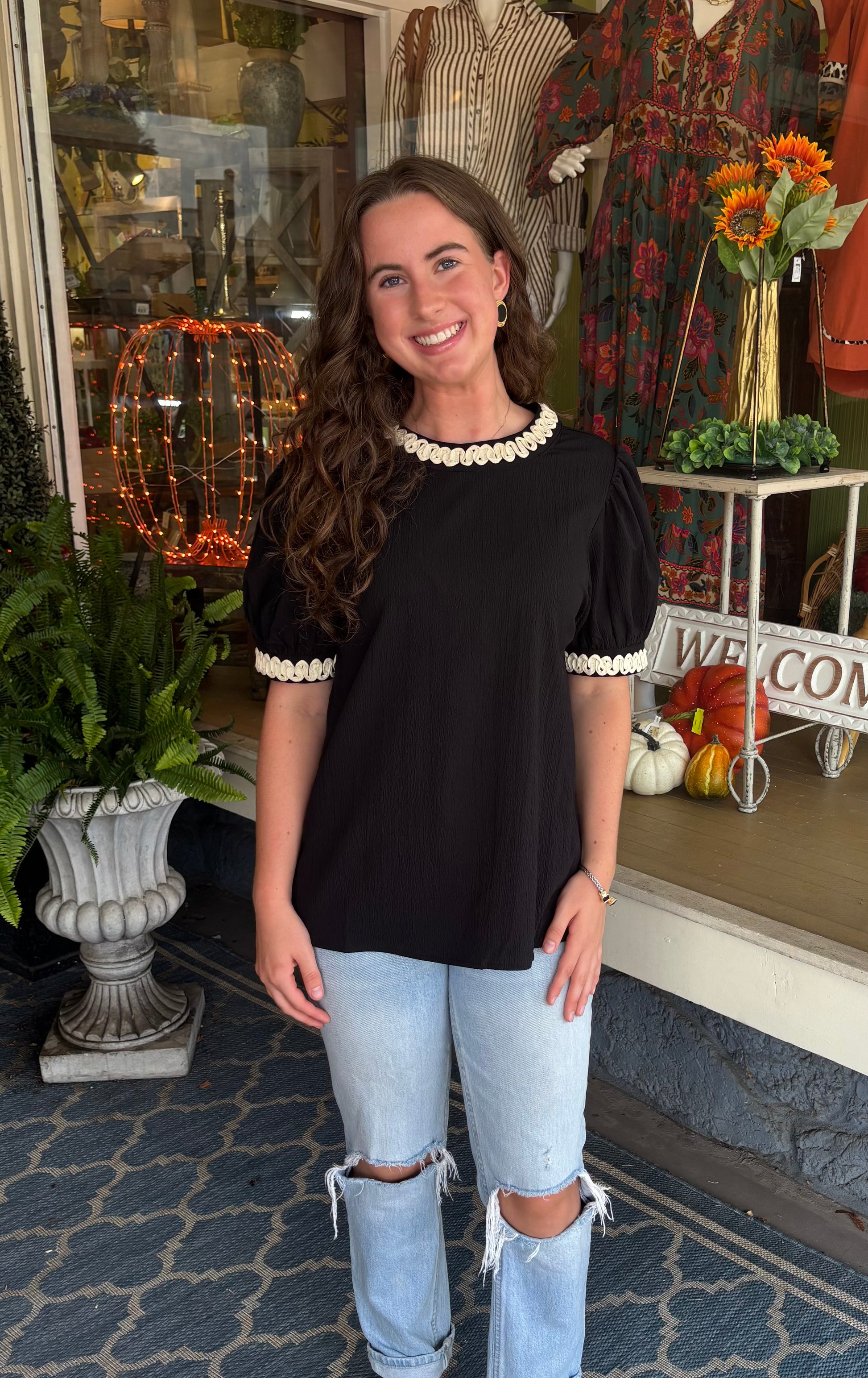 Solid top with U-neck, back key hole, puffed short sleeves, buttoned cuffs, and swirl color trimming edge.