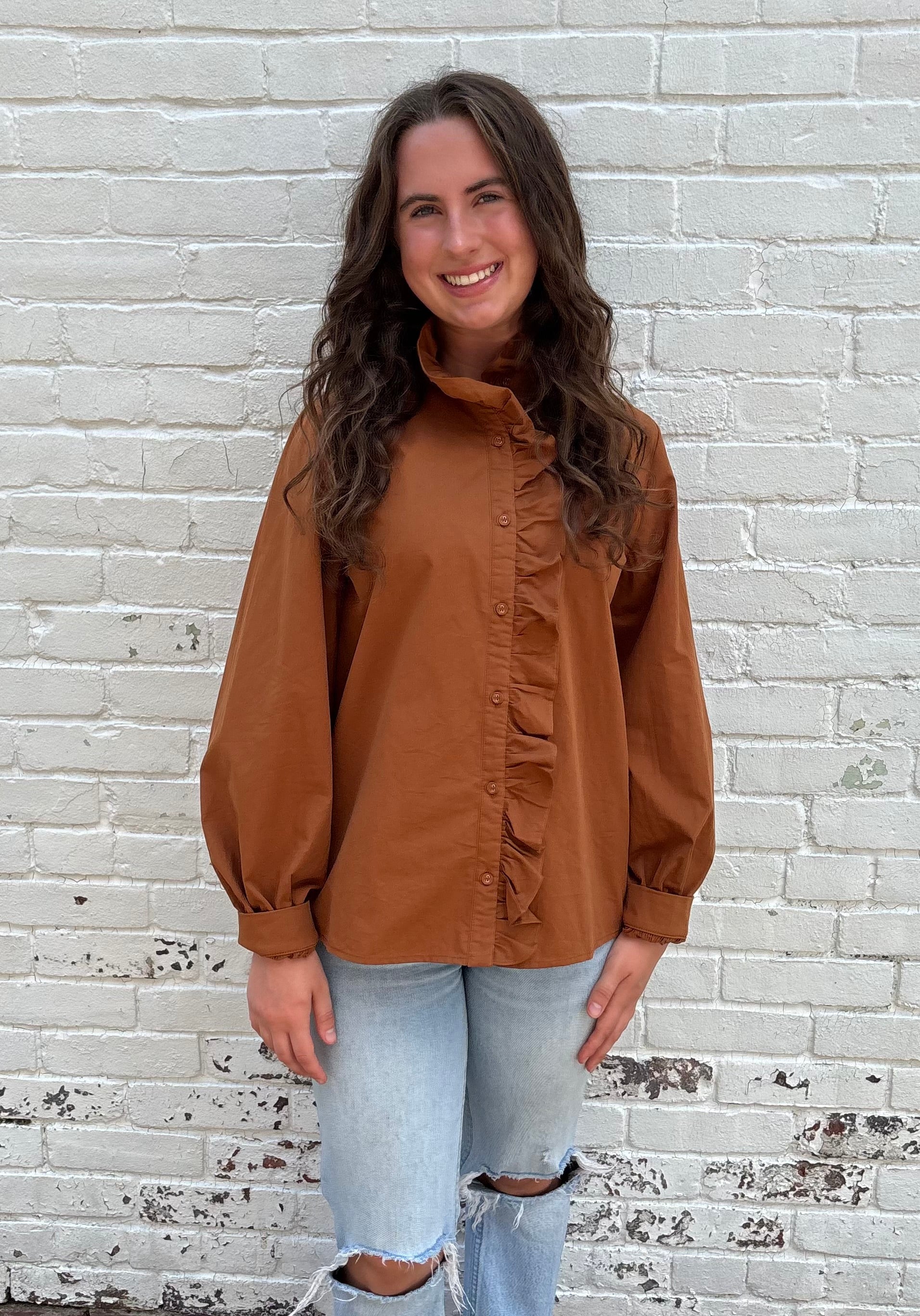 Ruffled Neck Blouse in a beautiful rust color!