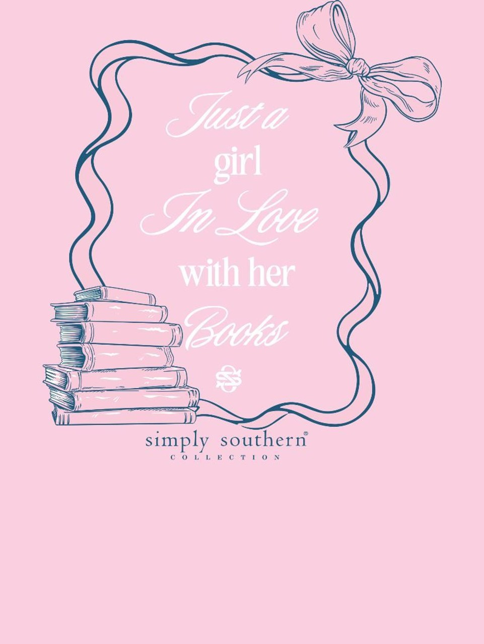 Mineral washed pink short sleeve shirt with the phrase 'Just a girl in love with her books' bordered by ribbon and a stack of books. Simply Southern logo.
