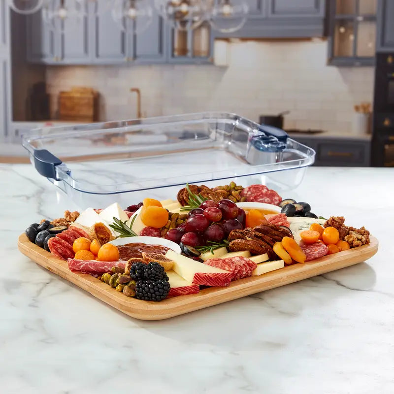 The practical locking plastic storage lid provides food freshness and security, making transporting your charcuterie board effortless. Ideal for gifting on various occasions, including weddings, newlyweds, hostess gifts, or housewarming presents, the "Build a Board" combines sophistication and utility for every celebration.