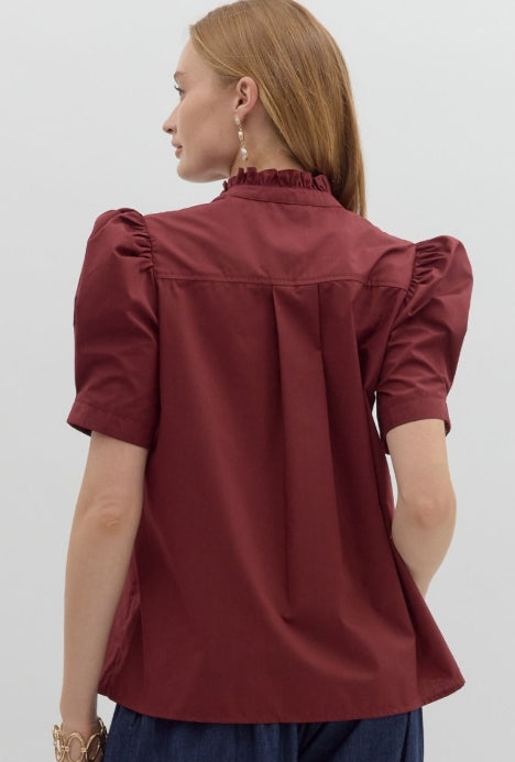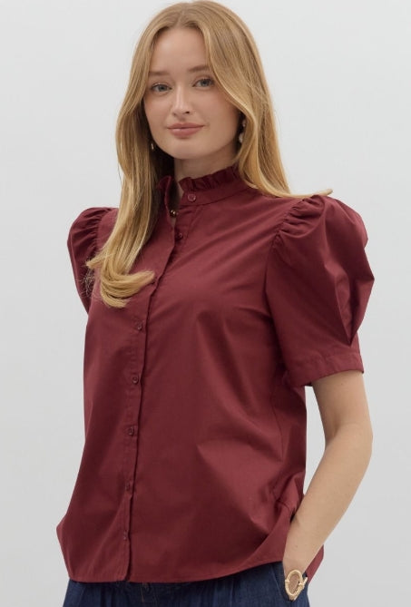 Solid puff shoulder short sleeve button front closure top featuring ruffle finish band collar. Unlined. Woven. Non-sheer. Lightweight.