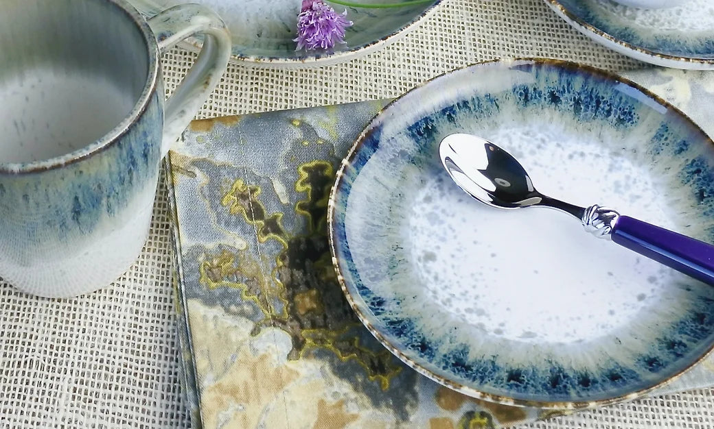 Cypress Grove adds a dramatic look to your home with the beauty of reactive glazes with stunning blues and browns. At the center of the place setting is our 10 1/4" dinner plate.