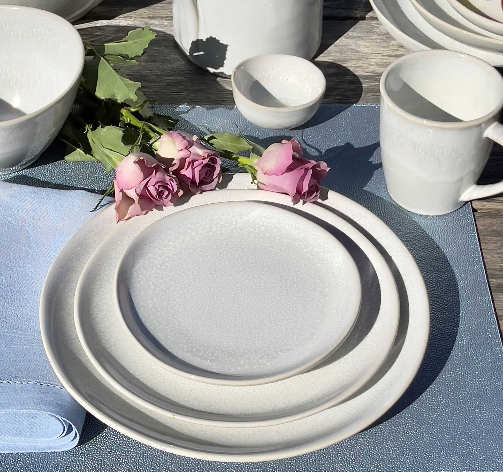 The Lily Valley stoneware collection brings to mind the floral beauty found throughout Carmel and Big Sur. No two flowers are ever the same and the gentle reactive glaze of Lily Valley creates the same subtle variety. At the center of the place setting is our 10 1/2" dinner plate.