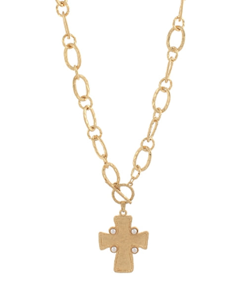 This worn gold necklace has 4 beautiful little pearls along the corners.