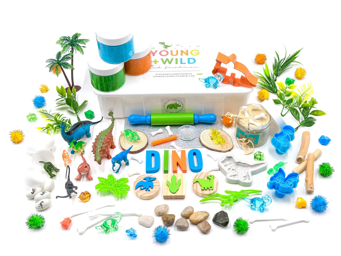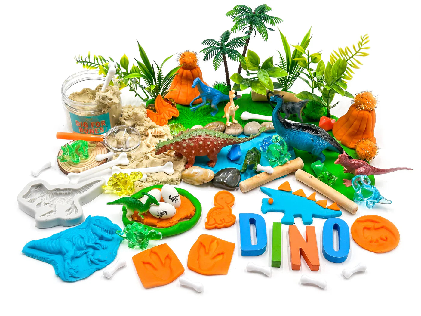 The Dino kit is every little explorers dream come true! So many ways to play and so much to do! Hatch baby dinos from the eggs, match dino tracks with the mini figures, and create the ultimate dinosaur world! Your little one will want to come back and play with their Dino kit over and over again!