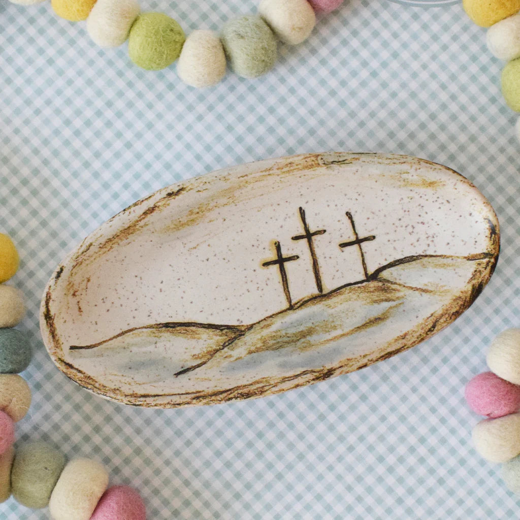 Enhance your decor with the Calvary Dish featuring three crosses on Calvary's Hill. Perfect for Easter or everyday use, this 9" x 4.5" dish adds a meaningful touch to any table or display. Show your faith and inspire others with this beautiful dish.
