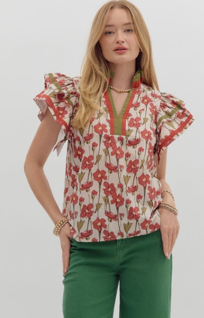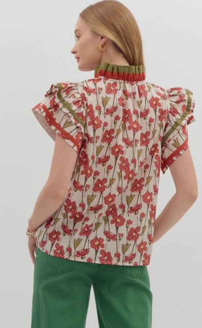 Floral print tiered flutter sleeve pullover top features multicolor accented ruffle neck and sleeve finish. Unlined. Woven. Non-sheer. Lightweight.