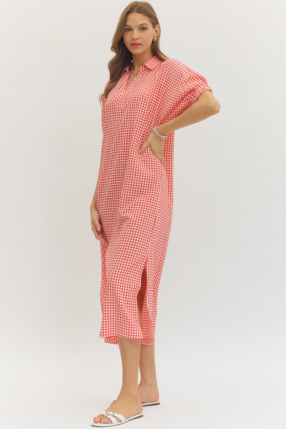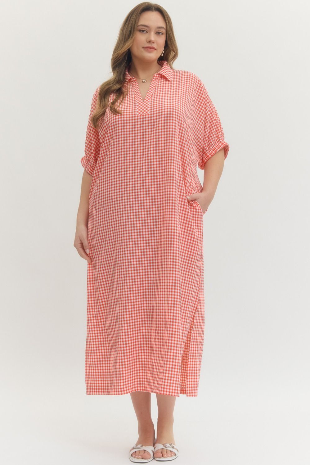 Gingham check short sleeve midi dress featuring collar with V-neckline. Cuffed sleeves. Side pockets. Unlined. Woven. Non-sheer. Lightweight.