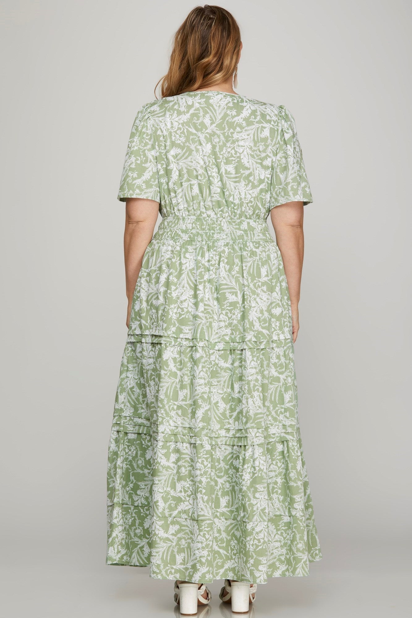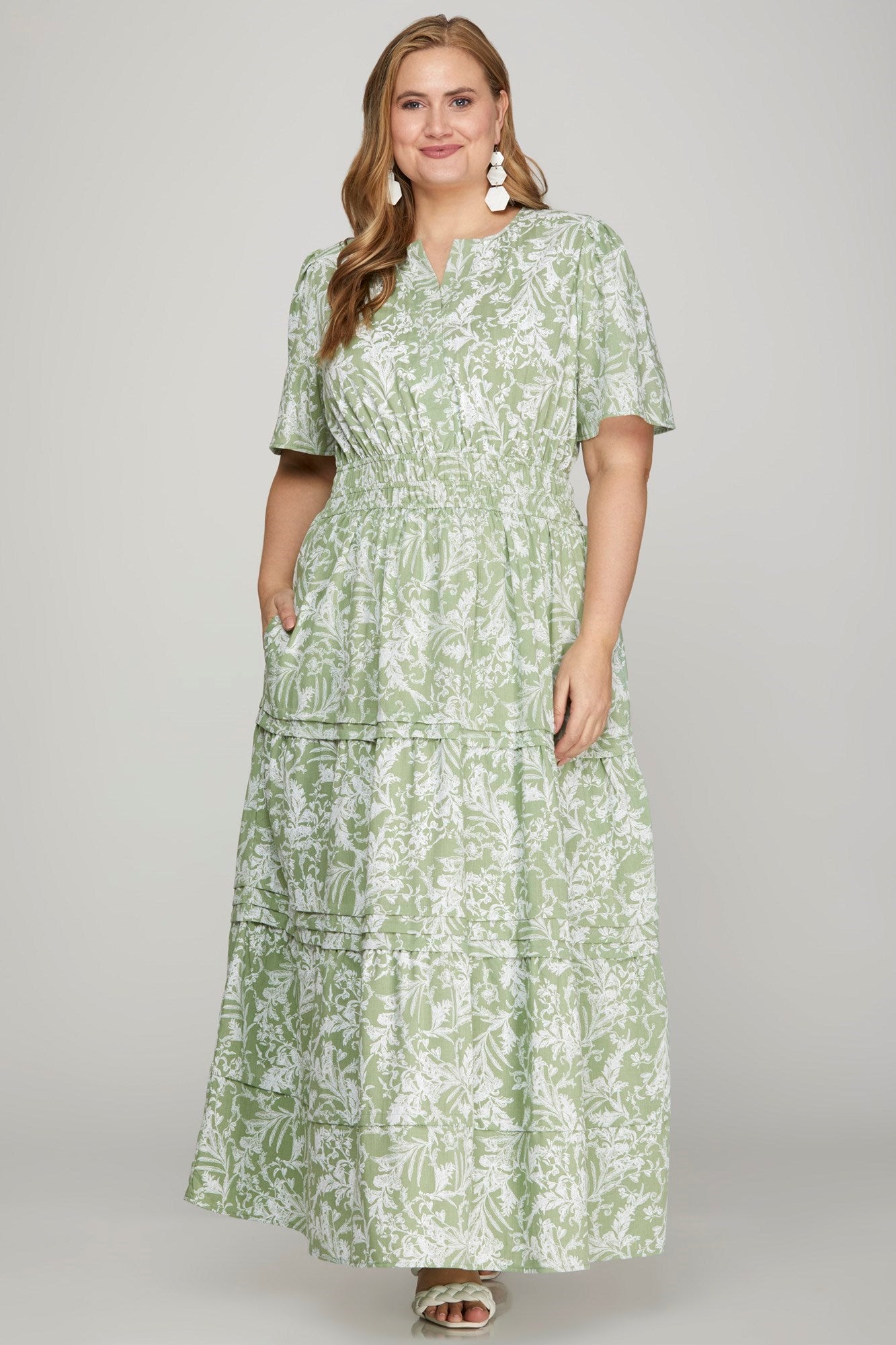 HALF SLEEVE WOVEN FLORAL PRINT TIERED PINTUCK MAXI DRESS WITH ELASTIC WAIST AND POCKETS