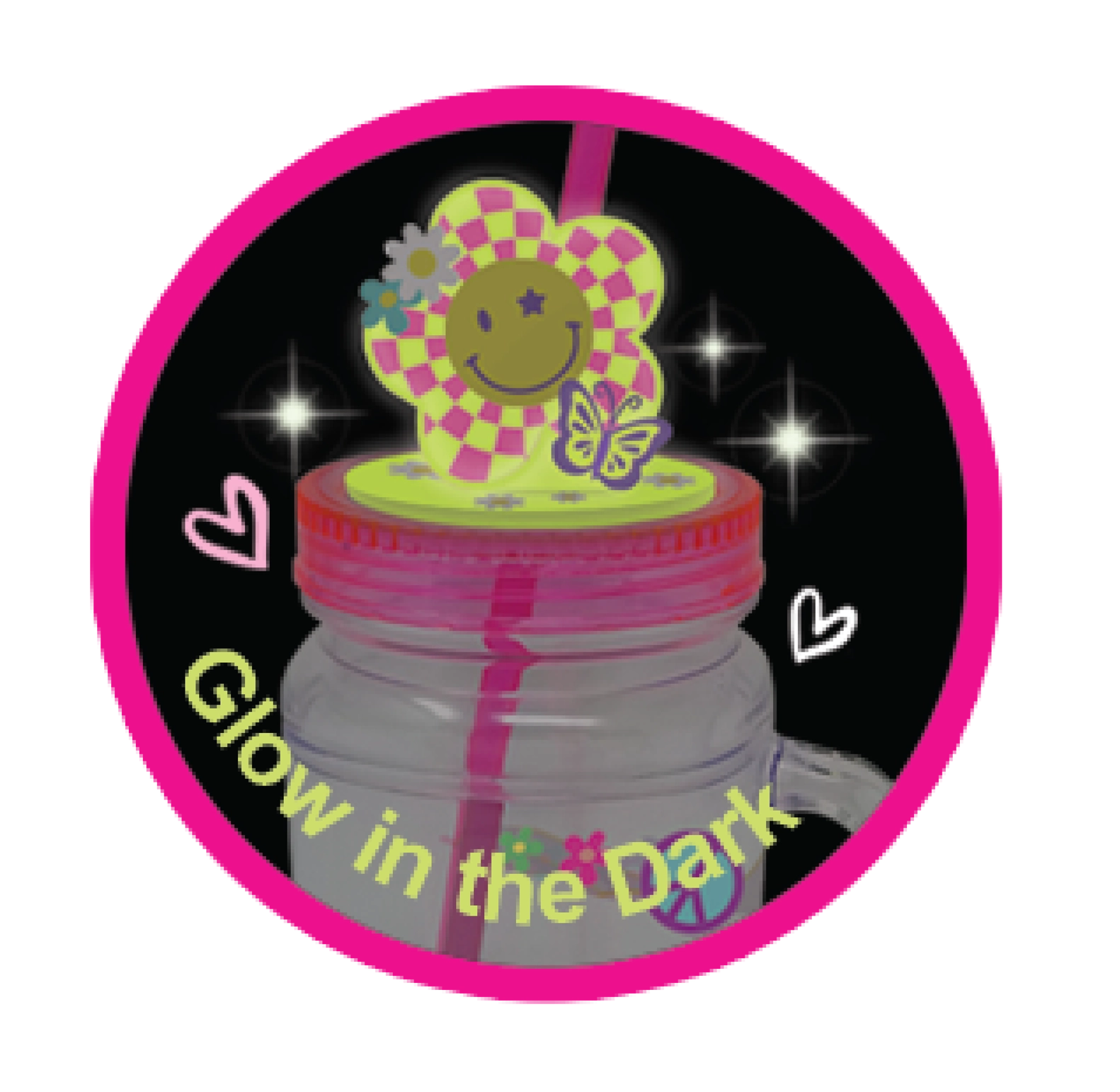A mason jar that glows in the Dark. Contain: 1 Mason Jar with Glow in the Dark Lid (BPA free, 19.3 oz) 1 Straw 1 Sheet of Vinyl Stickers