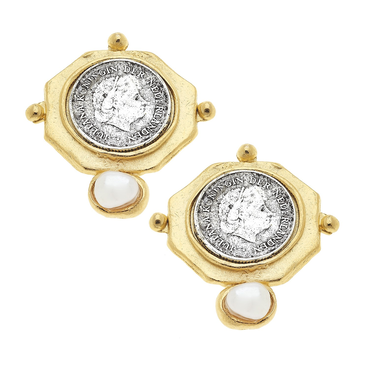 Susan Shaw Handcast Gold Octagon w/ Silver Coin and Freshwater Pearl Earrings 1128W