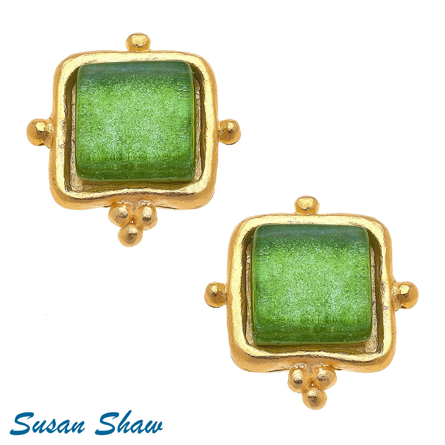 Susan Shaw Handcast Gold Square Green Earring 1735GR