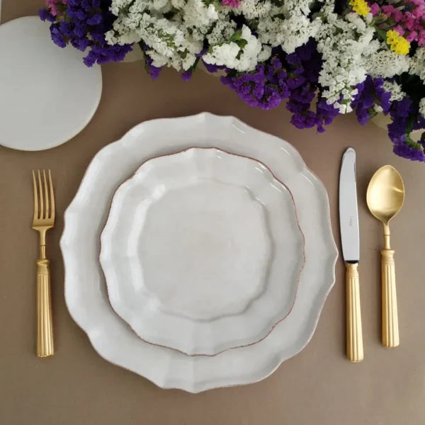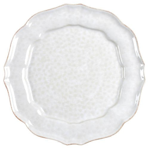 The Casafina Impressions Dinner Plate has scalloped edges and is hand glazed using a sponging technique. Made in Portugal.