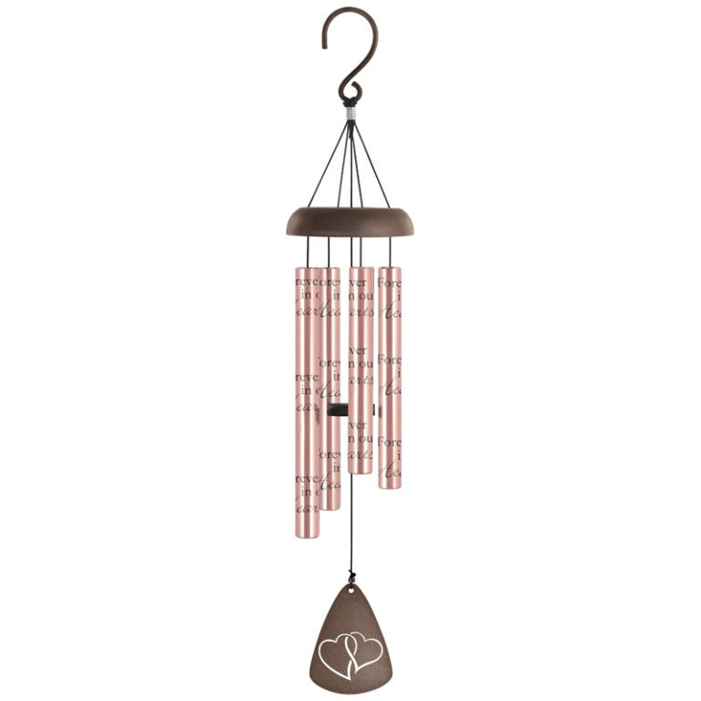 21" Rose Gold sonnet chimes have 4 heavy walled, center pinned tubes that emit sweet gentle tones. All aluminum construction, durable powder coated and anodized finish, and strung with industrial cord. Each chime has an adjustable striker. Tubes are 3/4" diameter, sentiment is printed directly onto the tubes.