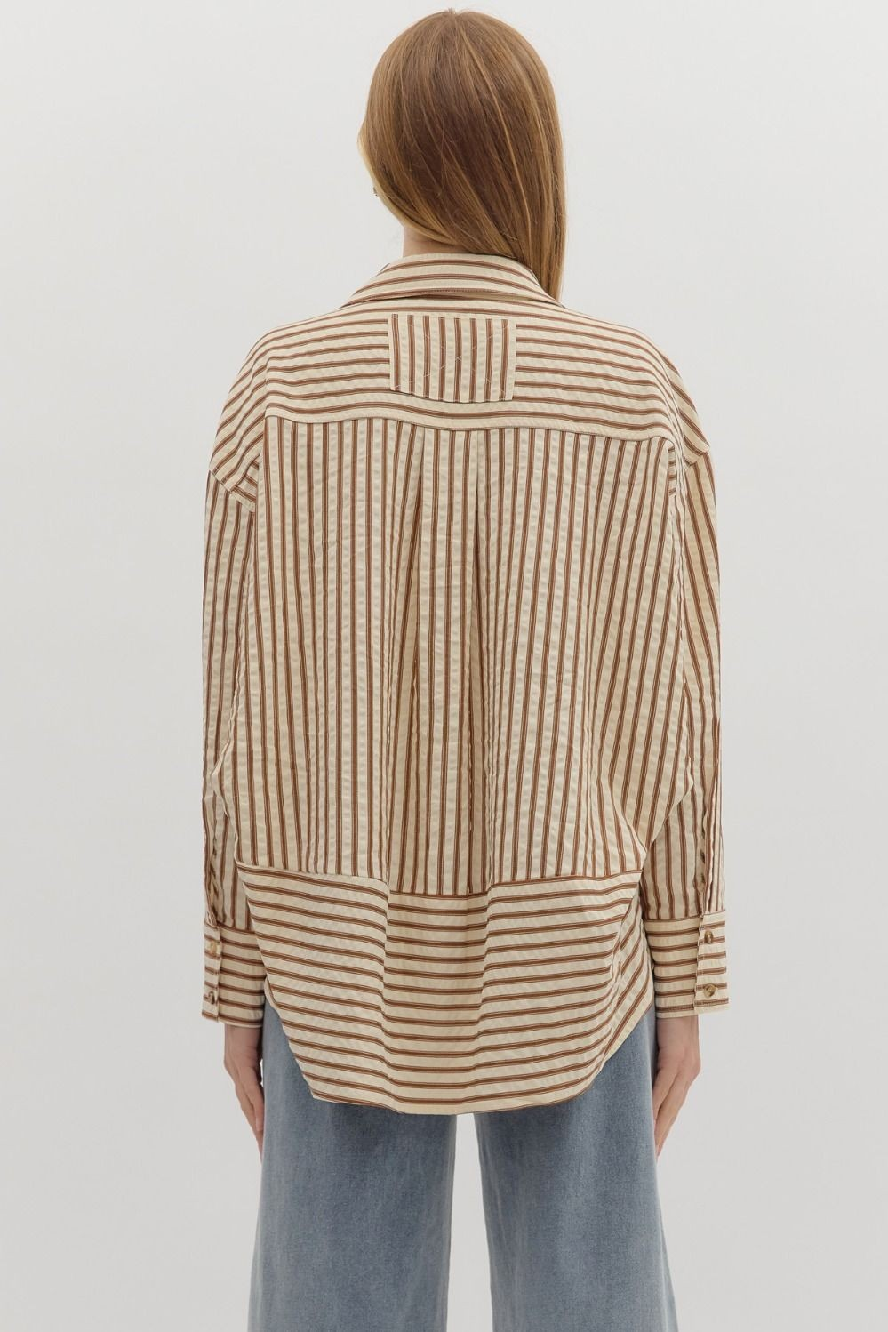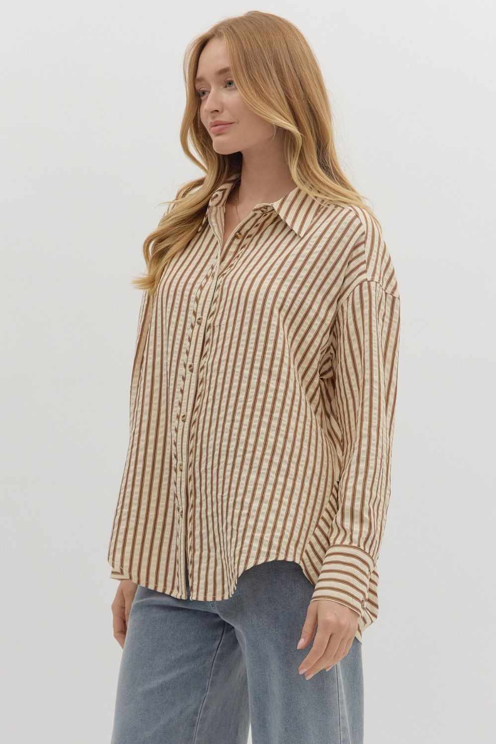 Textured striped pattern long sleeve button down collar shirt featuring pleated drape hem detail at back. Unlined. Woven. Non-sheer. Lightweight.