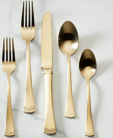 Complete with flared handles and a beaded channel at each base, this set includes forks, salad forks, knives, spoons and teaspoons that's perfect for serving.