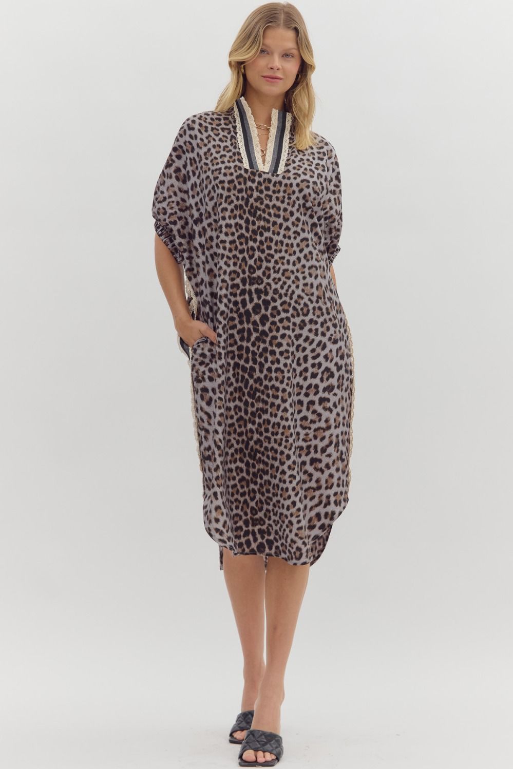 Leopard pattern ¾ dolman sleeve midi dress featuring accented lace edged multicolor rib band split neck. Pockets at sides. Lined. Woven. Non-sheer. Lightweight.