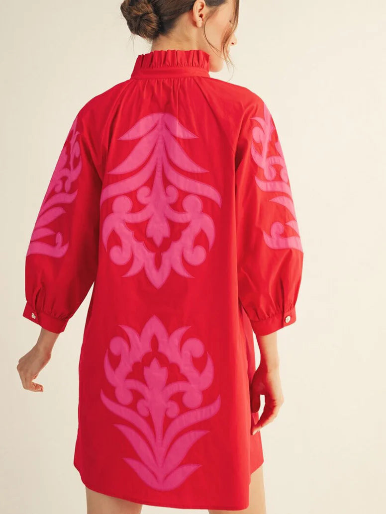 Beautiful 100% cotton red mini dress embroidered with pink details and a ruffled collar!