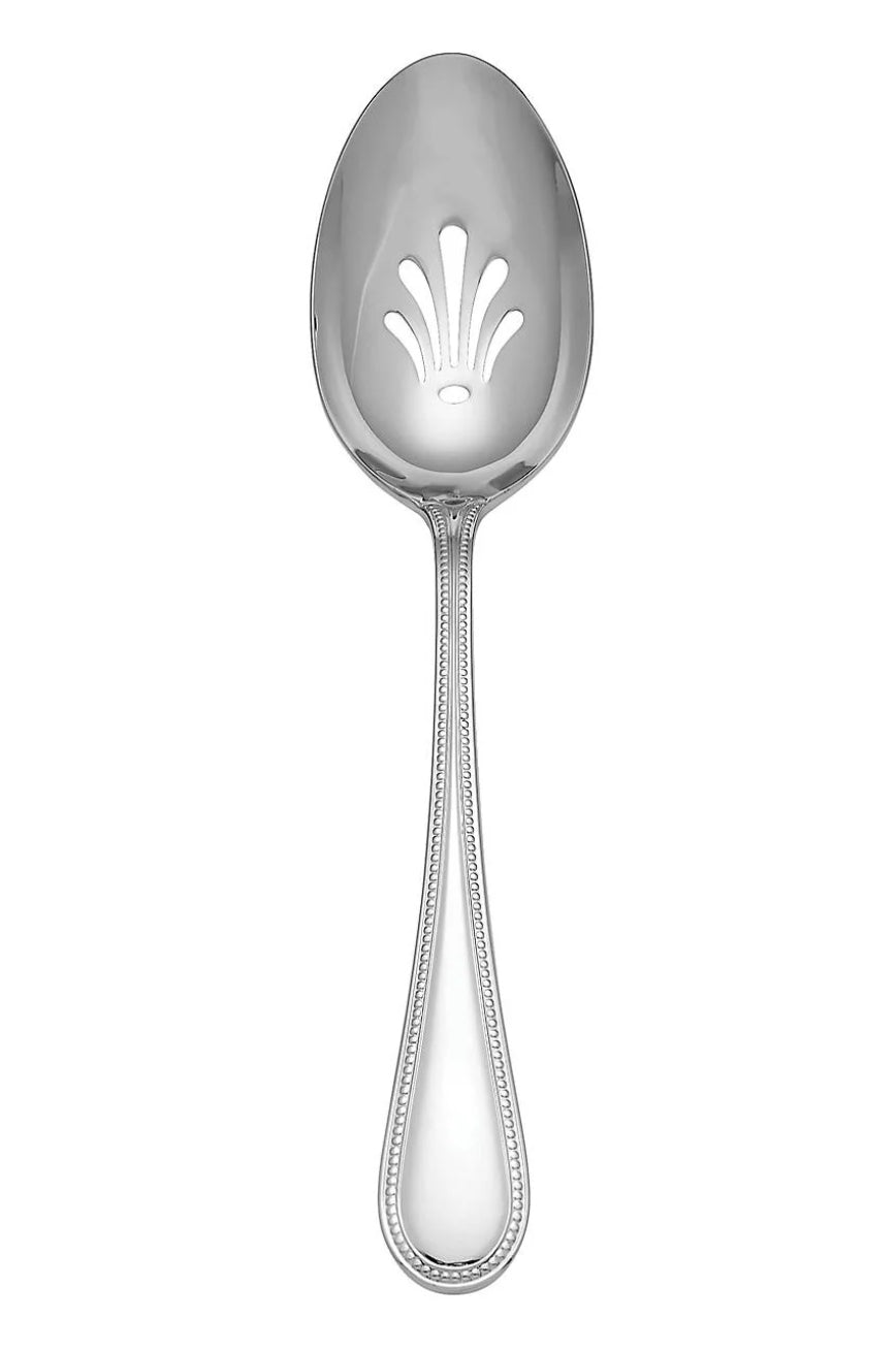 Part of the Lyndon Collection, this pierced buffet spoon is made of stainless steel and features a flourished cutout on its head with a delicate beaded border on the handle