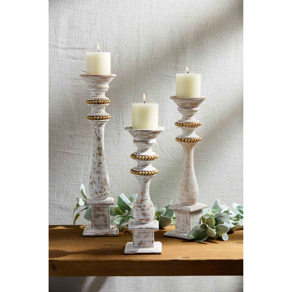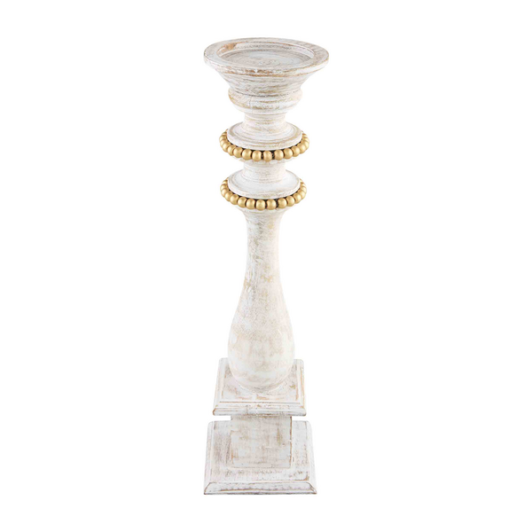 Add a touch of elegance to your space with our Medium Gold Beaded Candlestick. Crafted from durable mango wood, this stylish candlestick boasts a stunning white-washed finish that adds a timeless charm to any setting. With its distressed finish and unique markings, each candlestick showcases its individuality. The gold accent beads beautifully complement the design, creating a captivating centerpiece. Measuring 20" in height and featuring a 17" x 4" base, this candlestick combines practicality with exquisite craftsmanship. Elevate your decor with this versatile and eye-catching piece.