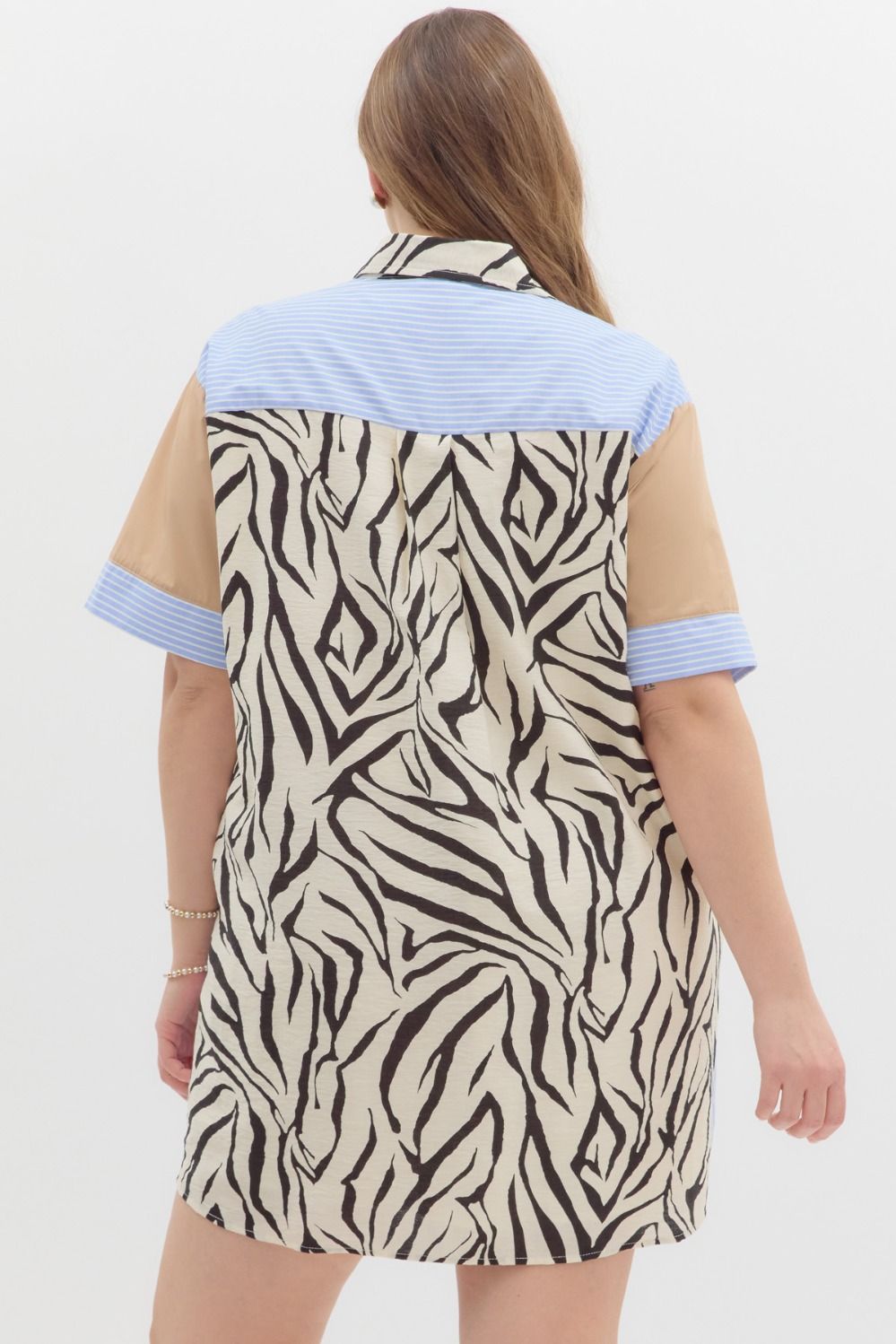 Multipattern classic collar button down short sleeve mini shirt dress featuring single shirt pocket. Lined. Woven. Non-sheer. Lightweight.
