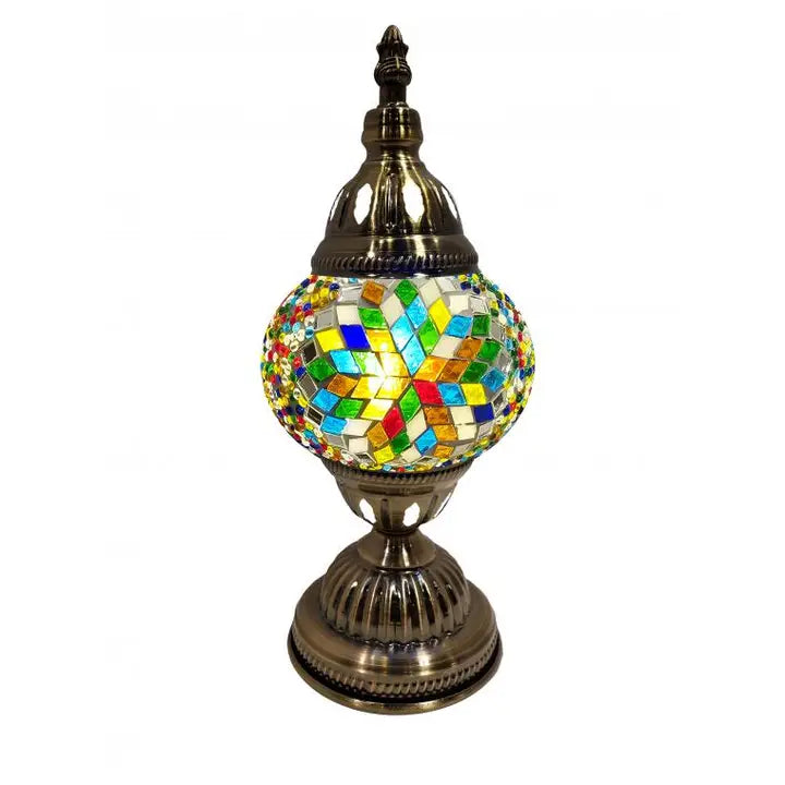 Turkish Mosaic Glass Desk Lamp approx 12" high by approx 5.25". Globe measures approx 4" high by 4.75" wide in a multi colored star pattern. Compatible with bulb E11 - sold separately style# LEDBULB-E12.