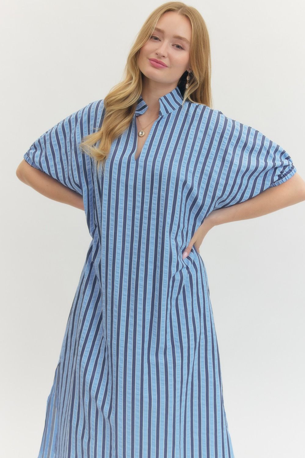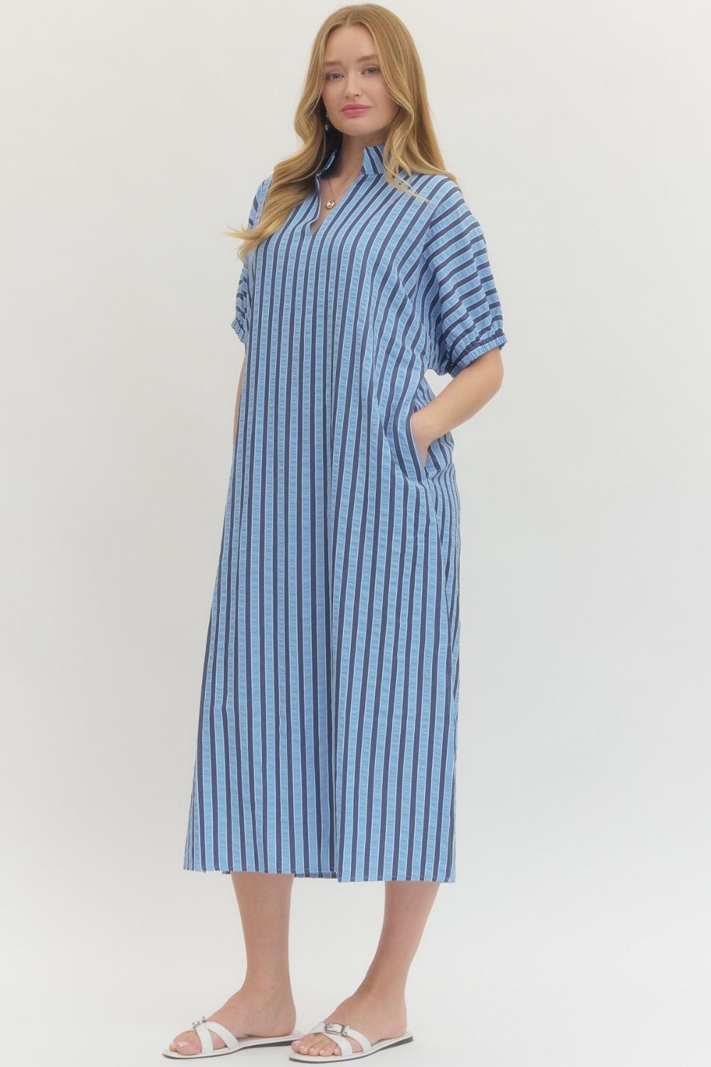 Striped short sleeve midi dress featuring collared V-neck and cuffed sleeves. Side pockets. Lined. Woven. Non-sheer. Lightweight.