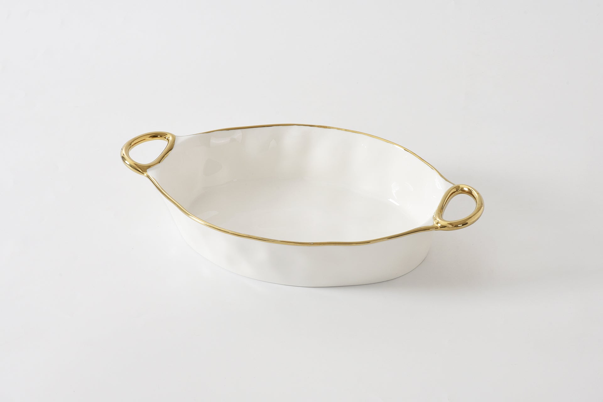 Oval Baking Dish in Golden Handles. Impress with your culinary skill and presentation by serving up delicious entrees or sides in these elegant oven-proof bakers. Gleaming white porcelain with smooth and graceful rim and handles in gold. Food safe. Dishwasher safe. Oven safe to 500°. Easy Care.