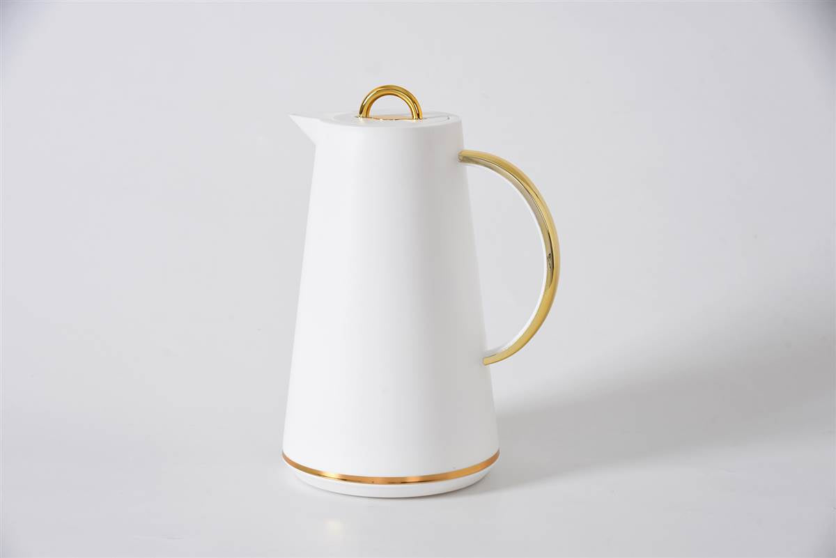 This Classic Thermal Carafe was crafted using vacuum insulation technology – keeping your beverages hot for up to 12 hours or cold for up to 24 hours. Featuring a sleek and modern design, this thermal beverage dispenser not only looks great on your table but also functions as a practical and convenient solution for serving hot or cold drinks. Crafted with a high-quality white body with gold detailing and unique pink glass inner lining. Handwash Only. Capacity: 1L