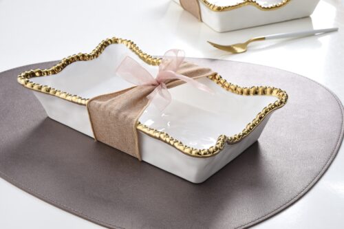 Dinner Napkin/Guest Towel Holder in Golden Salerno. Add a touch of luxury and elegance with this magnificent napkin holder. Place rolled cloth or paper dinner napkins in this beautiful holder for your next buffet or rolled hand towels in a powder room. Also great for serving up small pastries, sliced fruit and grilled vegetables. Gleaming white porcelain with lustrous gold beads in titanium. Food safe. Dishwasher safe. Oven safe up to 550” Easy Care.