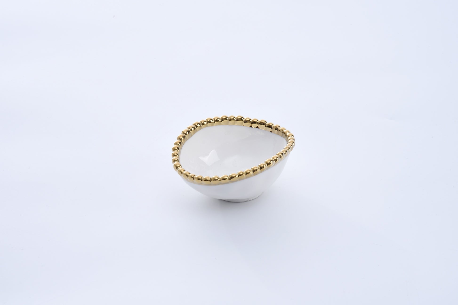 Oval Condiment Bowl in Golden Salerno. This multi-purpose bowl can serve as a condiment bowl on your counter, an addition to a cheese board for honey, or to hold sugar at brunch. High-fired white porcelain with lustrous gold beads in titanium.? Food safe, tarnish free, dishwasher safe, oven safe to 500°. Easy Care.