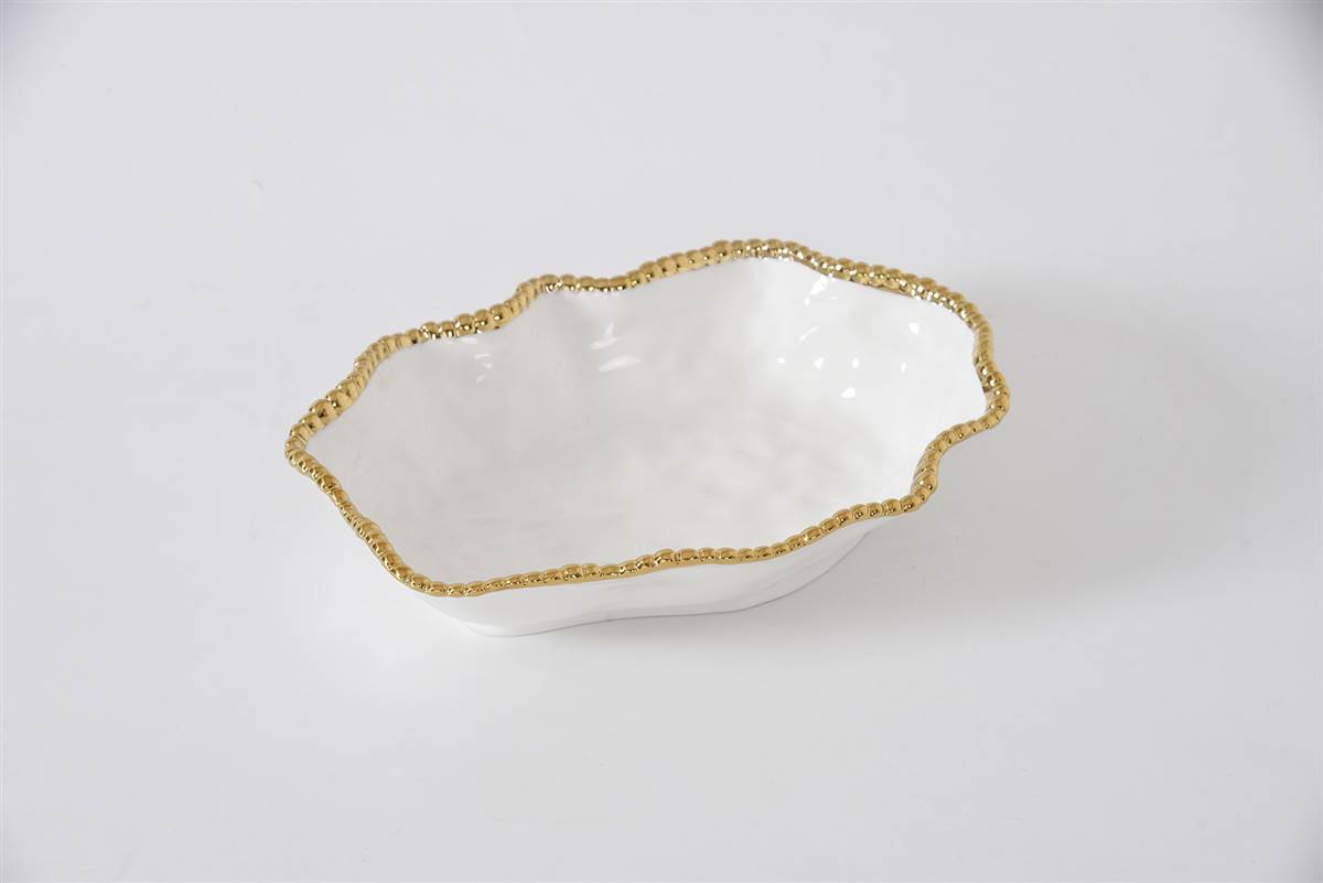 Serving Bowl in Golden Salerno. Whether you are serving stuffed shells, roasted chicken breasts or grilled vegetables, your food will look more elegant in this serving bowl. Gleaming white porcelain with lustrous gold beads. Food safe, tarnish free, dishwasher safe, oven safe to 500°F. Easy Care.