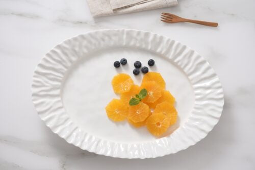 Large Platter in Mascali Bianca. Perfect for tempting guests with your delicious main course or hearty sides. Use for dessert to display an assortment of treats and sweets! Generously sized at 19″ in length. Versatile high-fired porcelain pieces that are microwave safe! Food safe, tarnish free, dishwasher safe, oven safe to 500°. Easy Care.