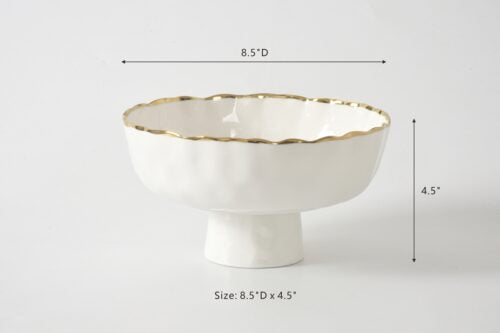 Medium Footed Bowl in Portofino. Elevate your fruit or use as a centerpiece. Gorgeous white porcelain with a delicate gold trim. Food safe, dishwasher safe, oven safe. Easy Care.