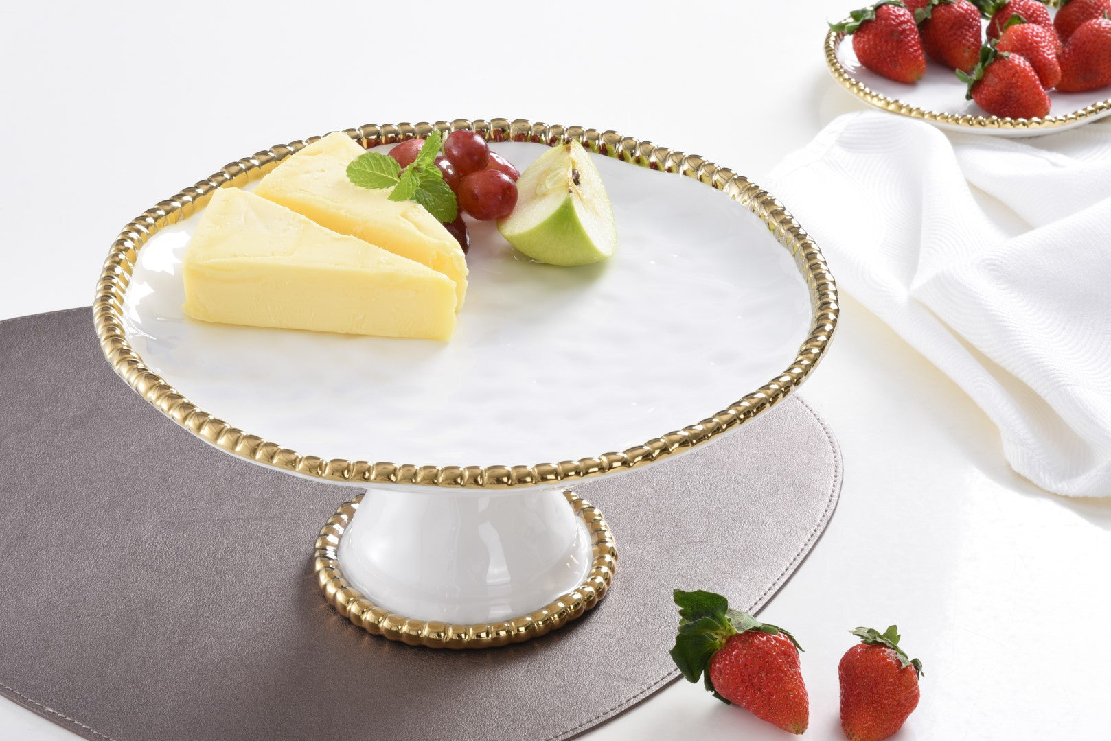 Round Cake Stand in Golden Salerno. An elegant way to present cakes, cupcakes and other pastries. Elevate your desserts to a new level! Gleaming white porcelain with lustrous gold beads in titanium. Food safe. Dishwasher safe. Oven safe to 500°. Easy Care.