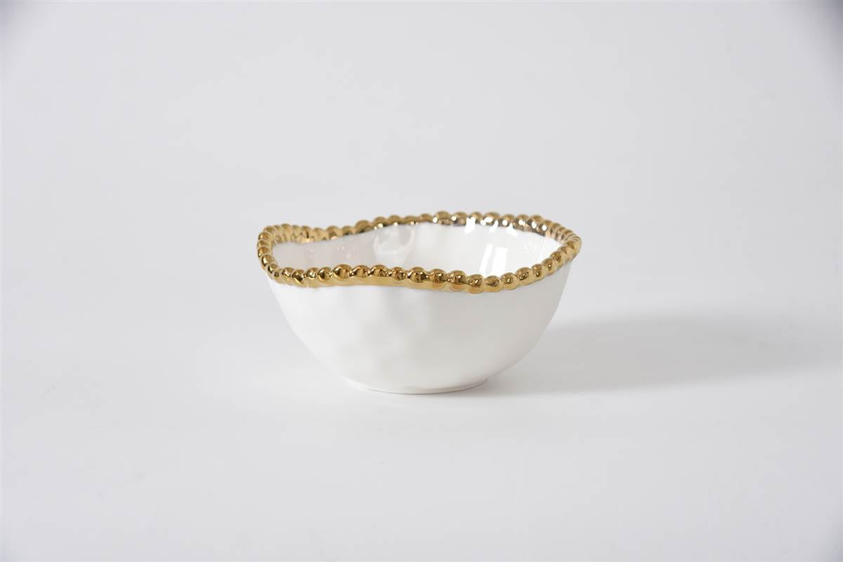 Snack Bowl in Golden Salerno. Perfectly sized for mixed nuts, berries, candies, dips, or even individual portions, this bowl is a must-have for every occasion – from casual snacking to taco night toppings. Gleaming white porcelain with lustrous gold beads. Food safe, tarnish free, dishwasher safe, oven safe to 500°F. Easy Care.