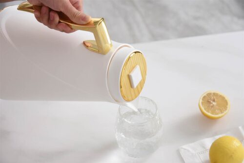 This Textured Thermal Carafe was crafted using vacuum insulation technology – keeping your beverages hot for up to 12 hours or cold for up to 24 hours. Featuring a sleek and modern design, this thermal beverage dispenser not only looks great on your table but also functions as a practical and convenient solution for serving hot or cold drinks. Crafted with a high-quality white body with gold detailing and unique pink glass inner lining. Handwash Only. Capacity: 1L
