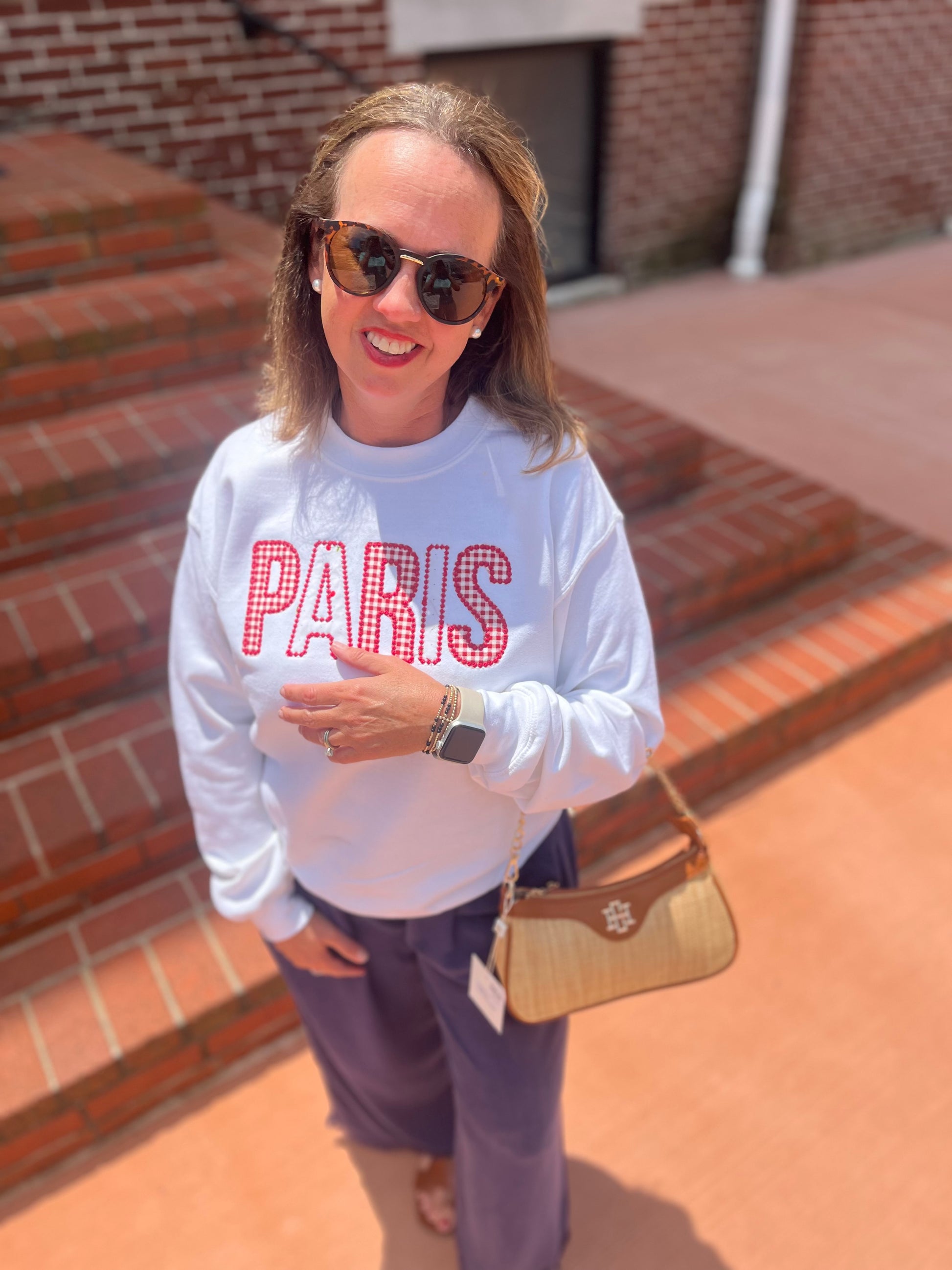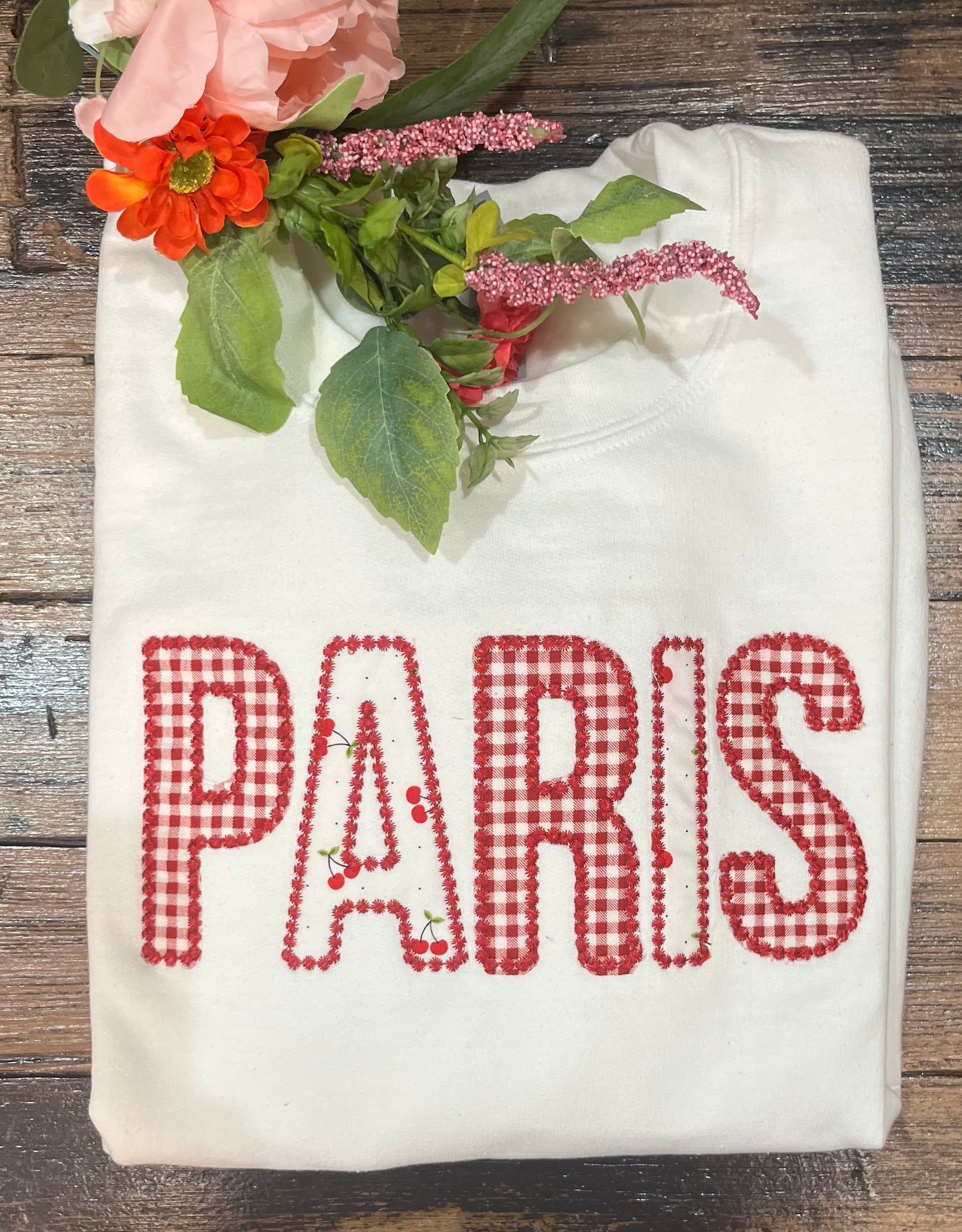 "Paris" sewn into a white sweatshirt with patch fabric that contains cherry and gingham patterns. The letters have a bold red trim outline.