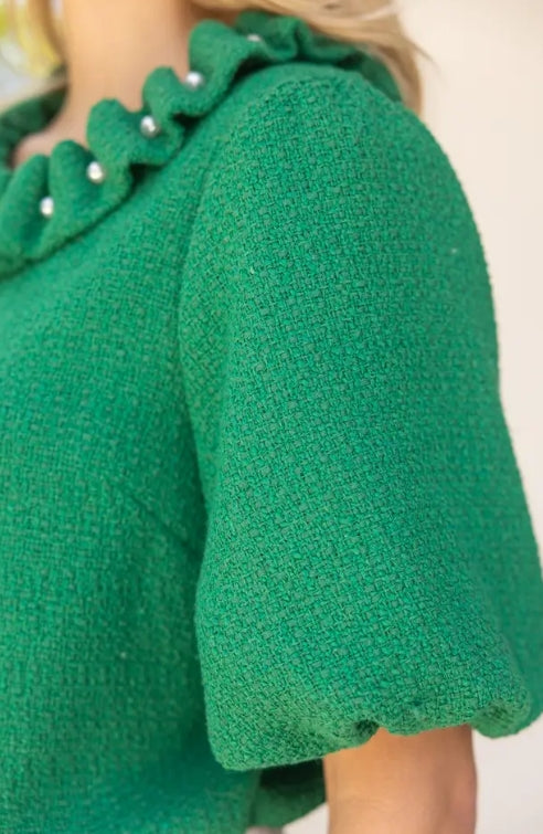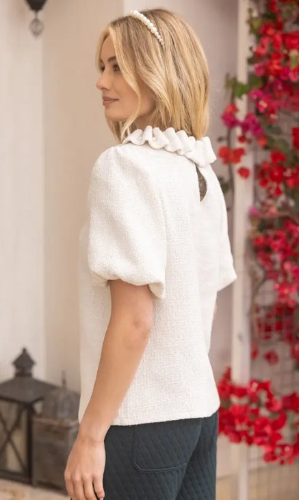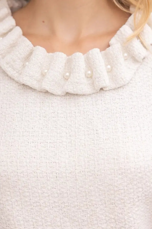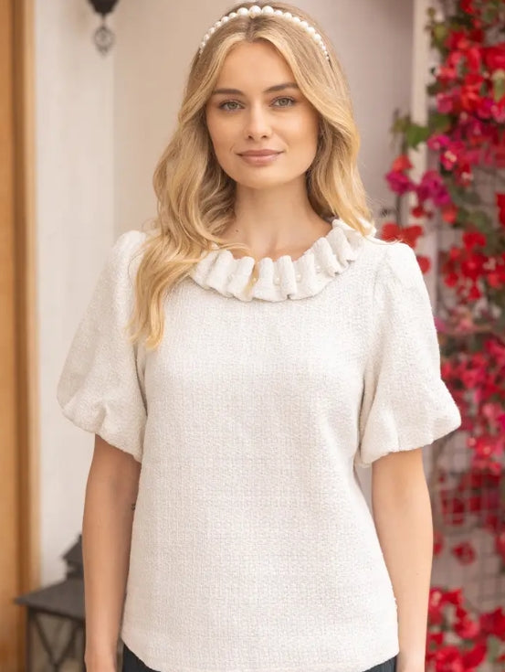 A beautiful and elegant textured short sleeve sweater. Adorned with classic pearls on the ruffled neckline.