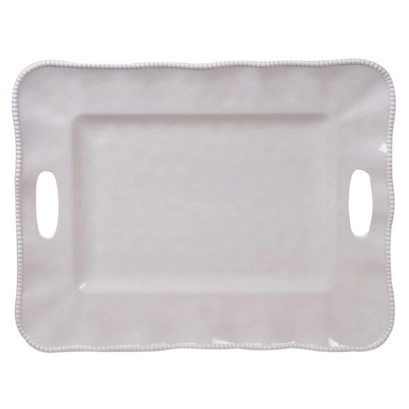 Introducing the Perlette Cream Rectangular Tray, a stylish and versatile addition to your home decor. With convenient handles and a spacious 19x15 inch size, this tray is perfect for serving and organizing. Elevate any room with the elegant Perlette design.