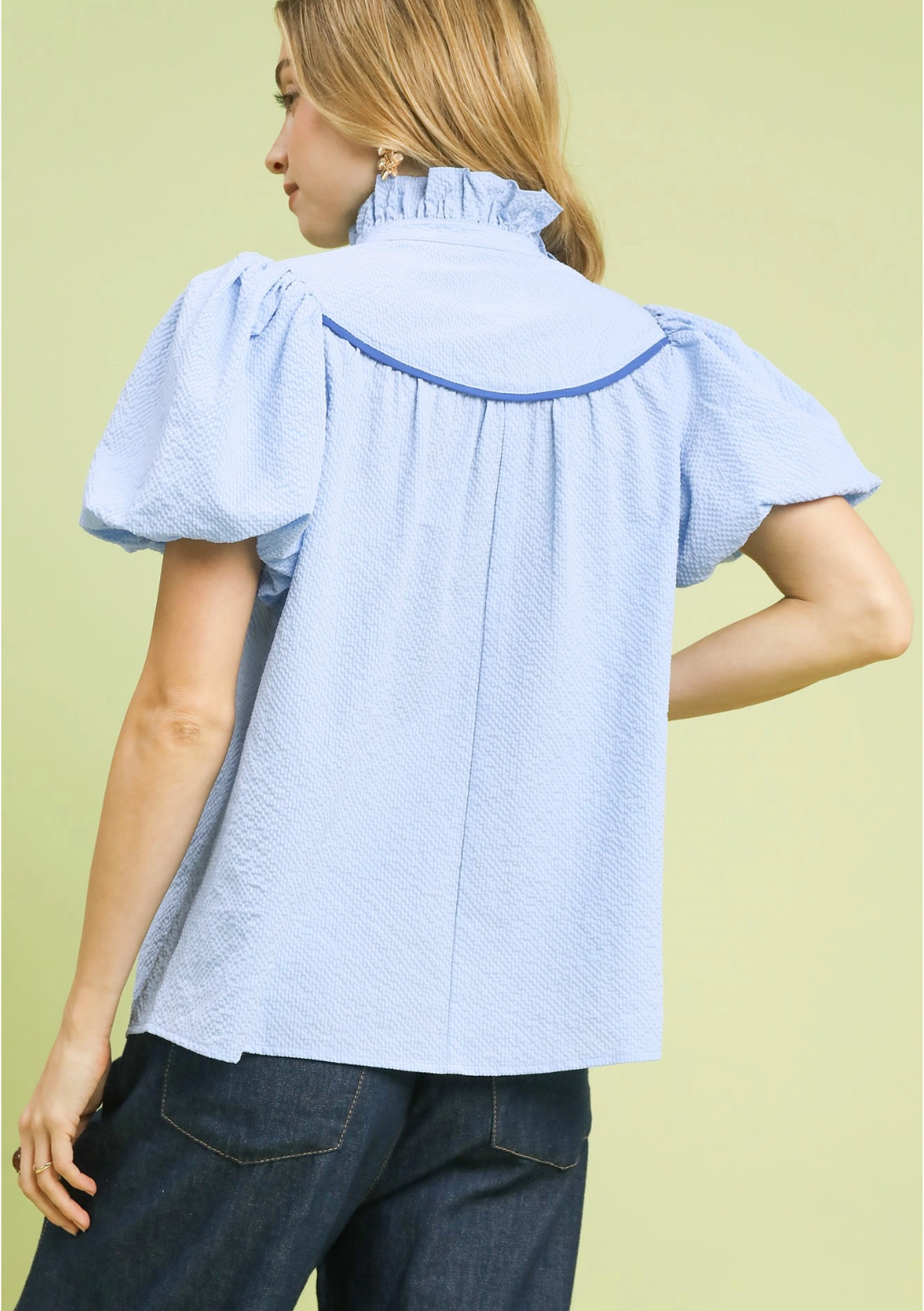 Beautiful sky blue blouse detailed with a dark blue trim around the neckline, ruffled collar, and a fun 3/4 puff sleeve!