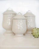 Hide all your kitchen treasures in these three descending sizes of elegant pedestal urn shaped canisters. Whether flour, sugar, candy, or cookies, you will smile every time you glance at these stunning, timeless pieces. Handcrafted in Portugal of ceramic stoneware. Freezer, oven, microwave and dishwasher safe.