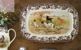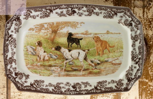 This rectangular platter from the Woodland collection features a black Labrador Retriever, a Golden Retriever, a Flat Coated Pointer, and an English Springer Spaniel.